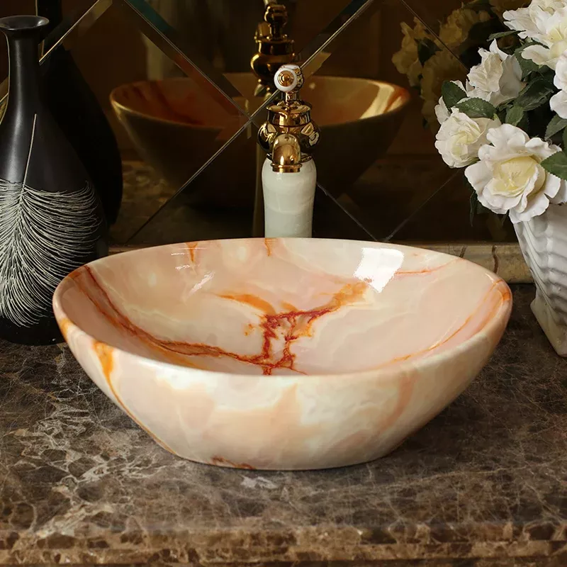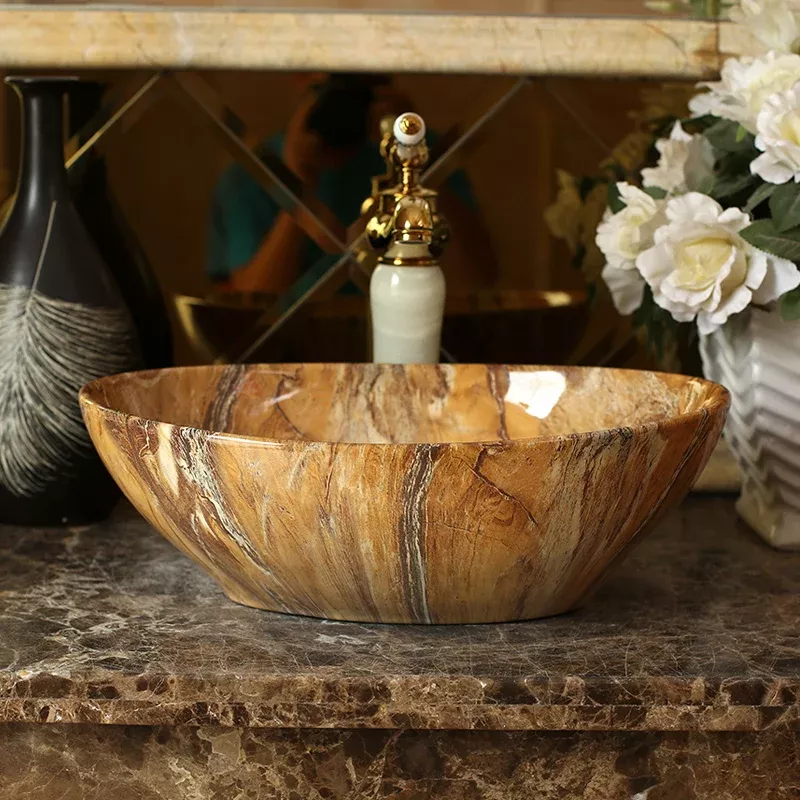 When I first laid my eyes on this countertop sink, it was like love at first sight. The hand-painted design captivated me instantly with its intricate detailing and vibrant color palette that brought an unexpected splash of life into my otherwise monotonous bathroom setup. But the beauty of this basin goes beyond just its visual appeal - it's as practical as it is aesthetically pleasing! Crafted from high-quality ceramic material, this oval-shaped basin offers ample space for all washing needs without taking up too much counter space – a perfect fit for any bathroom layout. Plus, the robust ceramic build ensures durability and longevity – no worries about scratches or dents here! Cleaning has never been easier; just a quick wipe down and the basin looks brand new again. And let's not forget about its marble finish that adds an extra touch of elegance to the whole look! This isn't just a washbasin - it's a statement piece that brings art right into your bathroom!