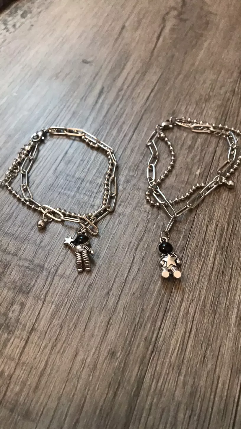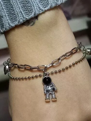 Each bracelet is crafted with precision, featuring a charming star-shaped pattern and an astronaut pendant that adds a touch of cosmic wonder. The double-layer link chain, made of high-quality zinc alloy, is durable yet lightweight, ensuring comfort and longevity. The lobster-claw clasp provides secure closure, making it easy to wear all day.