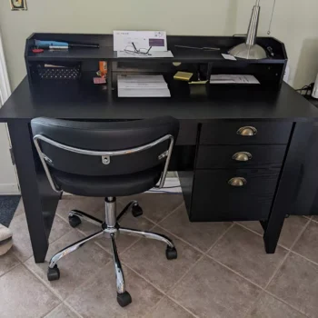 This desk isn’t just about looks; it’s about making your work or study time as comfortable and productive as possible. The large desktop offers plenty of room for multiple monitors, laptops, and essential supplies. The additional desktop shelf is perfect for keeping books, photo frames, or your coffee cup within easy reach. Our thoughtful design includes a cable management hole to keep your workspace neat and tidy.