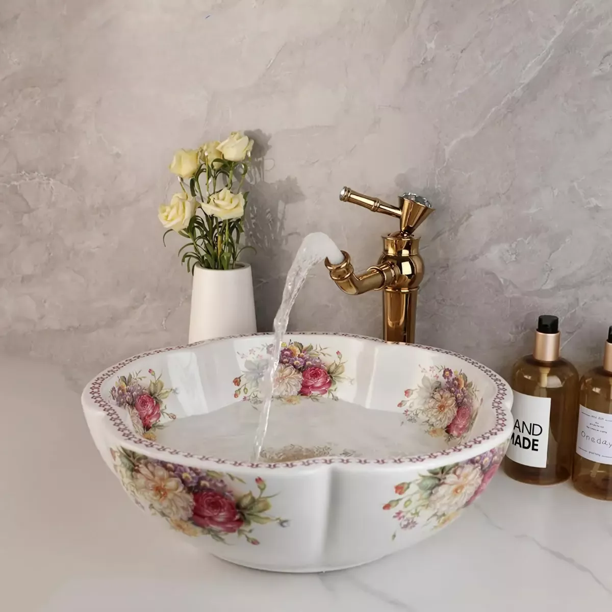 What truly sets our Elegant Petal Shaped Ceramic Vessel Sink apart is its blend of functionality and art. The hand-painted flower and bird pattern brings nature’s beauty indoors, creating a serene and elegant bathroom atmosphere. The solid brass antique faucet complements the sink perfectly, offering a smooth and reliable water flow. The above-counter installation not only adds a modern touch but also ensures ease of use and maintenance. Upgrade your bathroom today with our Elegant Petal Shaped Ceramic Vessel Sink with Antique Brass Faucet. Experience the perfect combination of style, durability, and convenience. Click the “Add to Cart” button now to transform your bathroom into a sanctuary of elegance and sophistication.