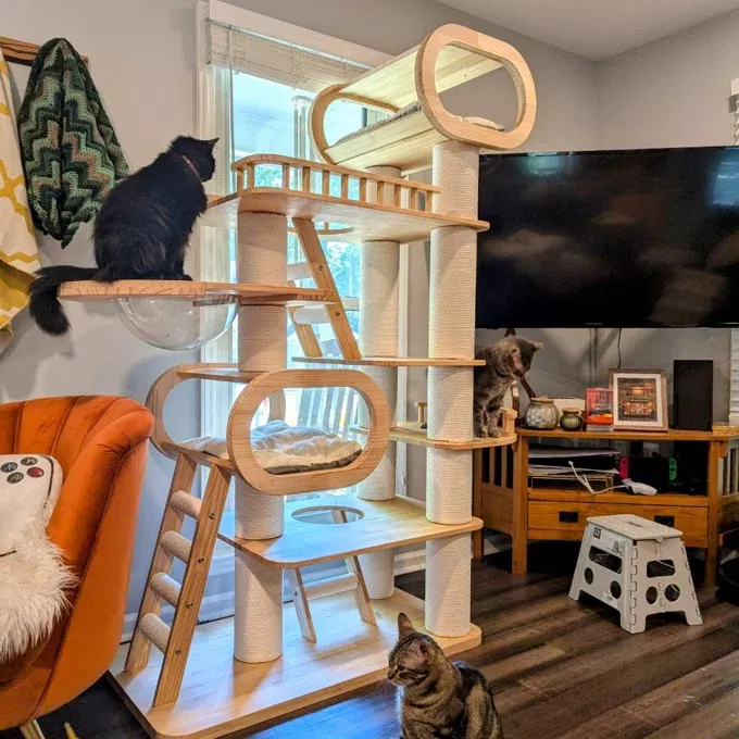 Whether you have a playful kitten or a laid-back senior cat, our cat tree is the ideal choice. It’s perfect for multi-cat households, providing each cat with their own space. The tree’s elegant design seamlessly integrates with any home decor, making it a stylish and functional addition to your living space.