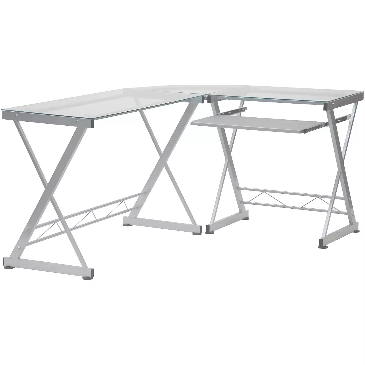 Modern L-Shaped Tempered Glass Computer Desk with Steel Frame and Pull-Out Keyboard Tray