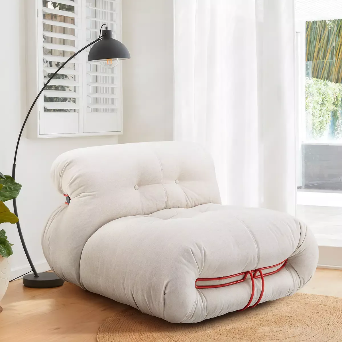 The unique curvilinear shape of this sofa chair, inspired by the human form, ensures the utmost comfort. Its body, wrapped in plush upholstery and supported by a sturdy metal brace, is both stylish and durable. The seat and backrest cushions are adorned with a quilted effect, featuring upholstered buttons that add to its charm. The use of high-quality materials like Chenille knitted fabric and metal guarantees longevity and enduring appeal.