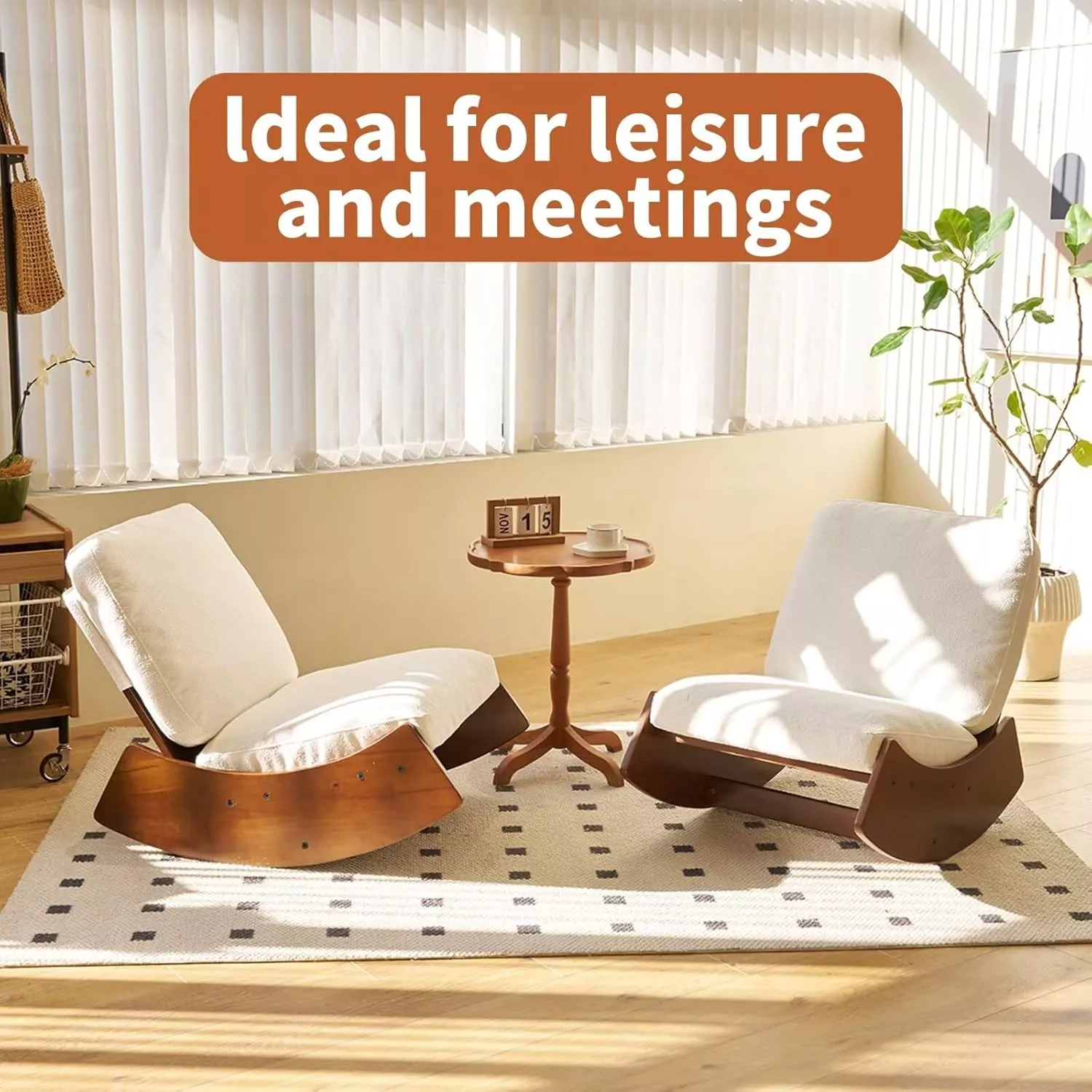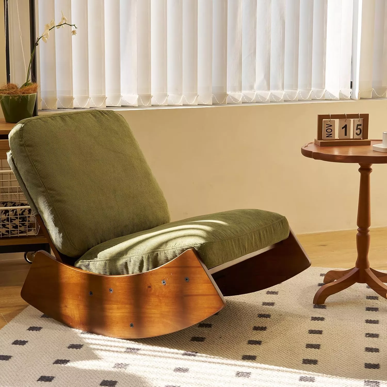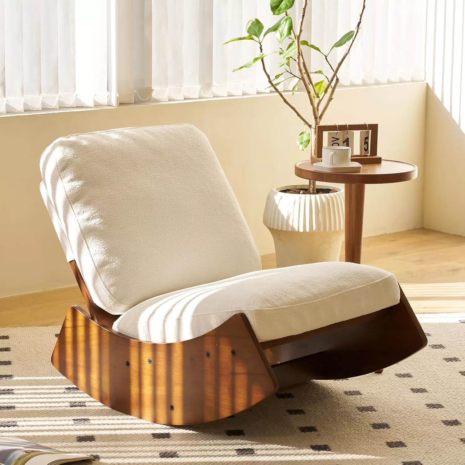 Wrapped in breathable, skin-friendly boucle fabric, this chair feels as good as it looks. The solid wood base not only ensures durability but also delivers a smooth, gentle rocking motion. Two felt pads underneath protect your flooring and reduce noise for a peaceful experience. And when it’s time to clean, the cushions are easy to remove and maintain, keeping your space fresh and tidy.