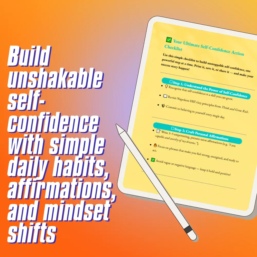 Unlike generic self-help PDFs, this checklist is focused, practical, and rooted in proven strategies — combining the transformational ideas of Think and Grow Rich with modern mindset practices like self confidence affirmation routines. It’s not just about feeling better; it’s about becoming bolder through action.